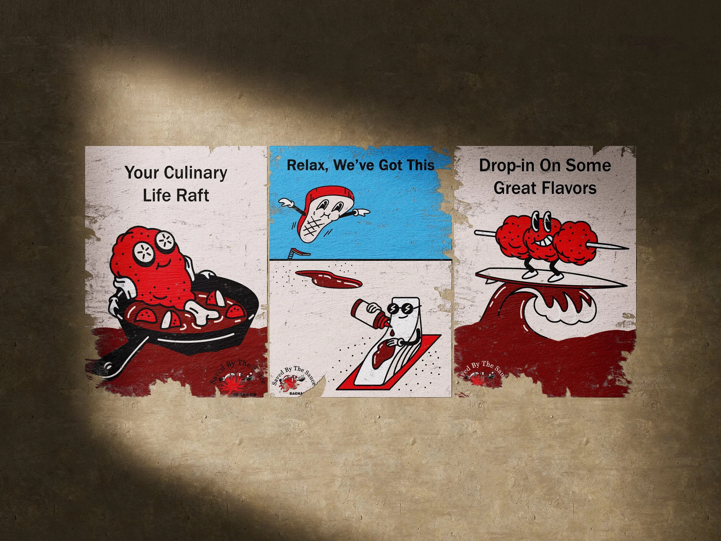 Guerilla Style wheat pasting around popular food areas showing Bachan’s food characters and telling people Bachan’s sauce can save you from any delivery or culinary disasters