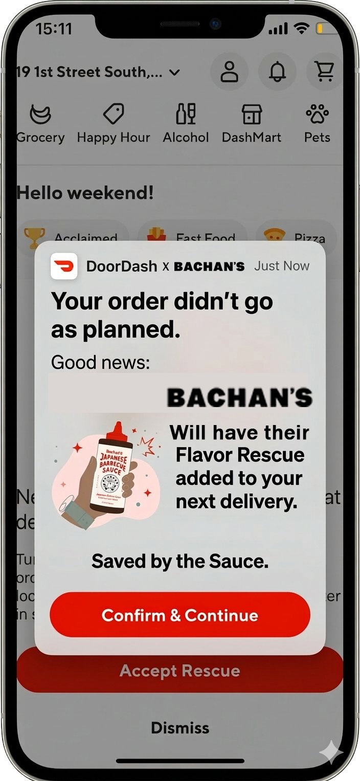 Bachan’s teams up with DoorDash to rescue delivery disasters. When customers report an issue with their order in the DoorDash apps help section (old fries, soggy noodles, the wrong item) they’ll unlock a Bachan’s Flavor Rescue.